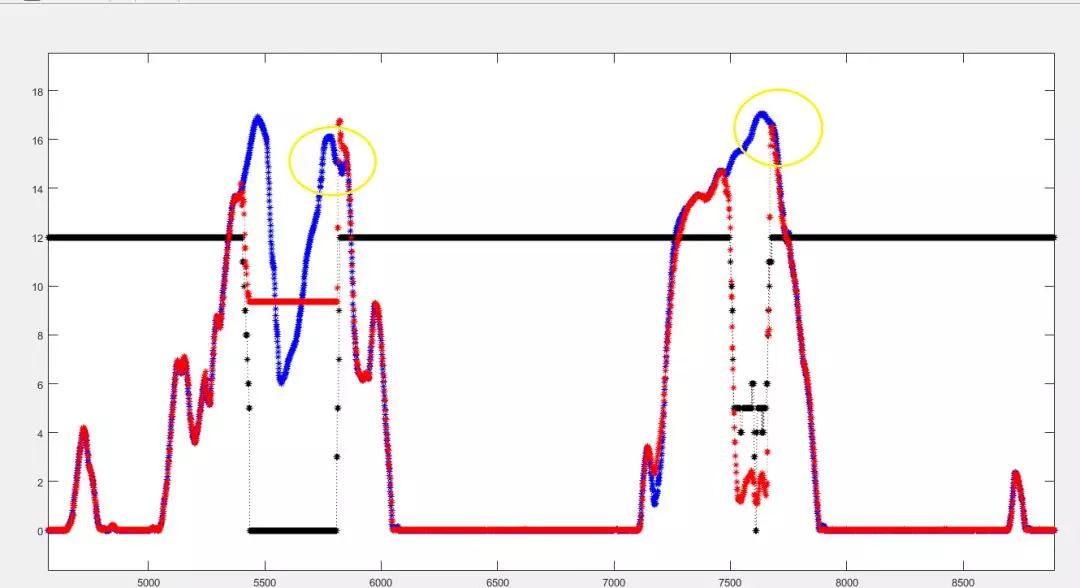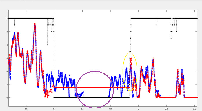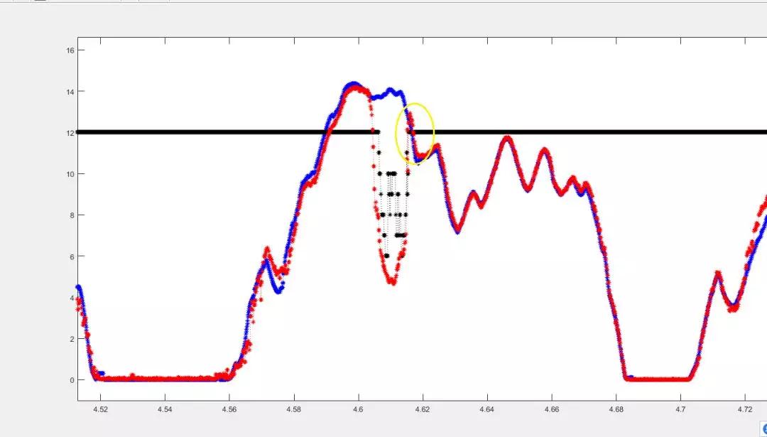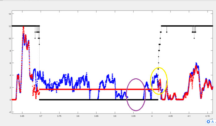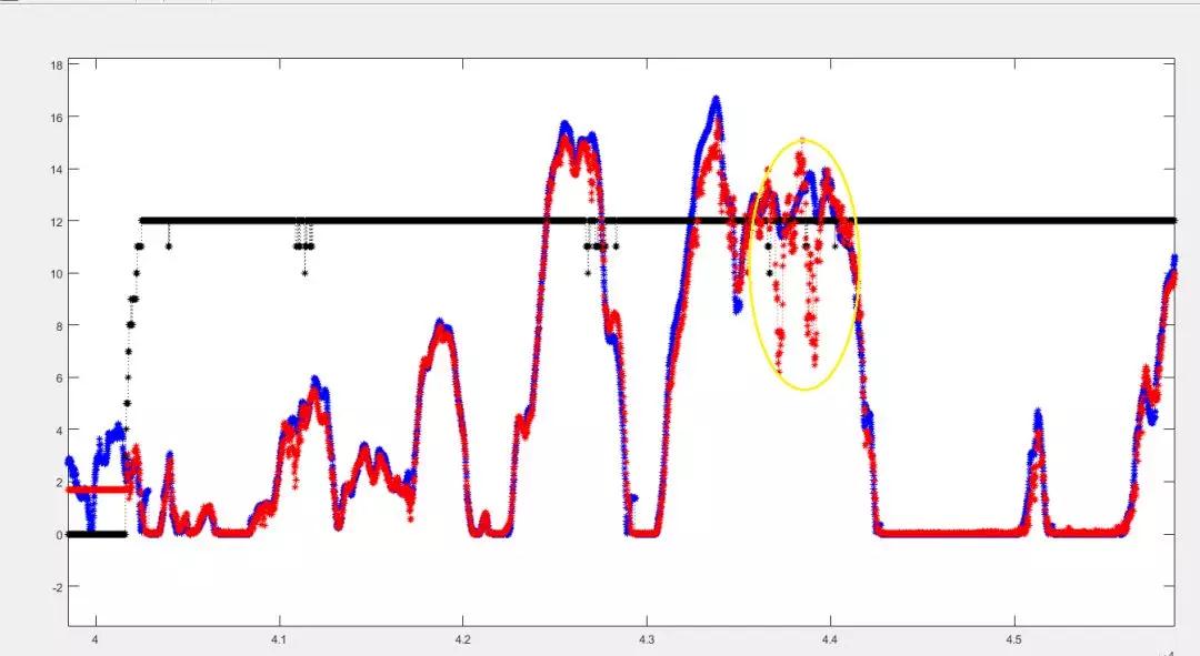 图所示:红色为卫星定位速度,蓝色为惯性导航定位速度,黑色为卫星数。
