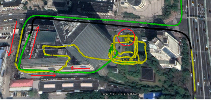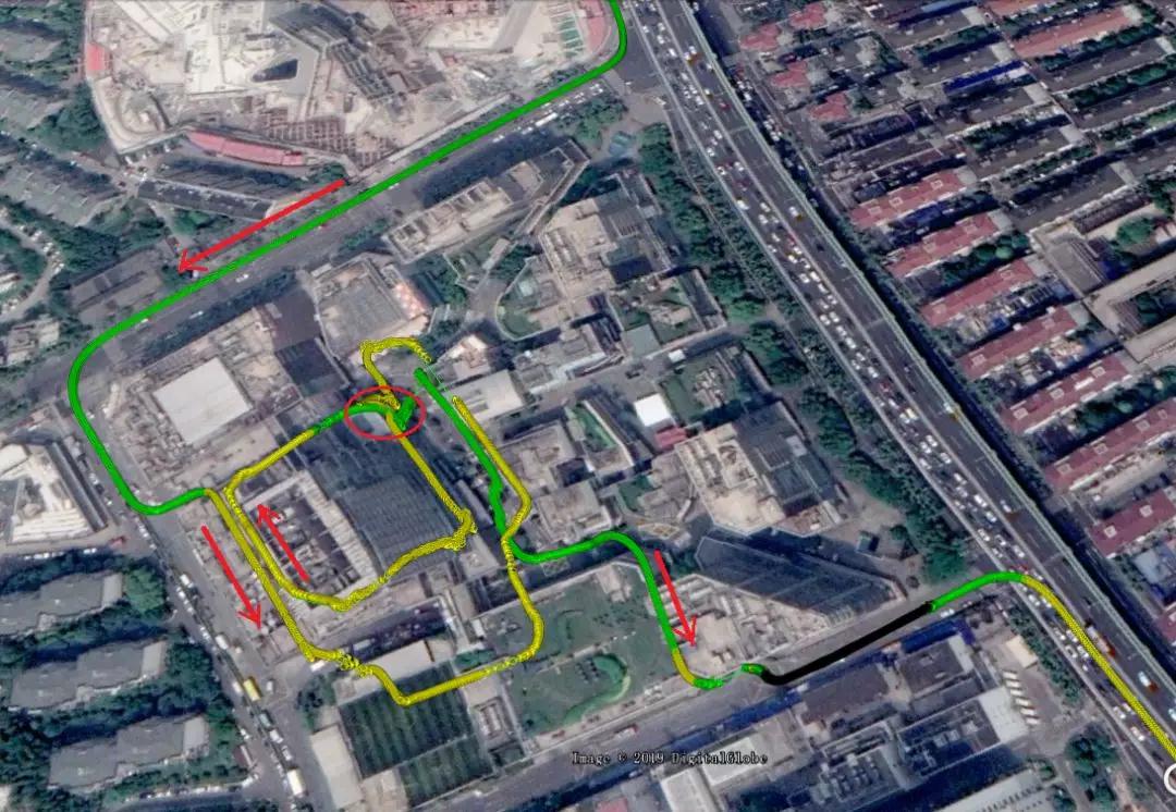 通过上述驾驶行为,惯性导航还可以获得非常好的车辆轨迹。尤其是在车库的出口可以看出,车辆计入车库和车辆出车库的轨迹非常重合,说明了惯性导航性能的稳定性。