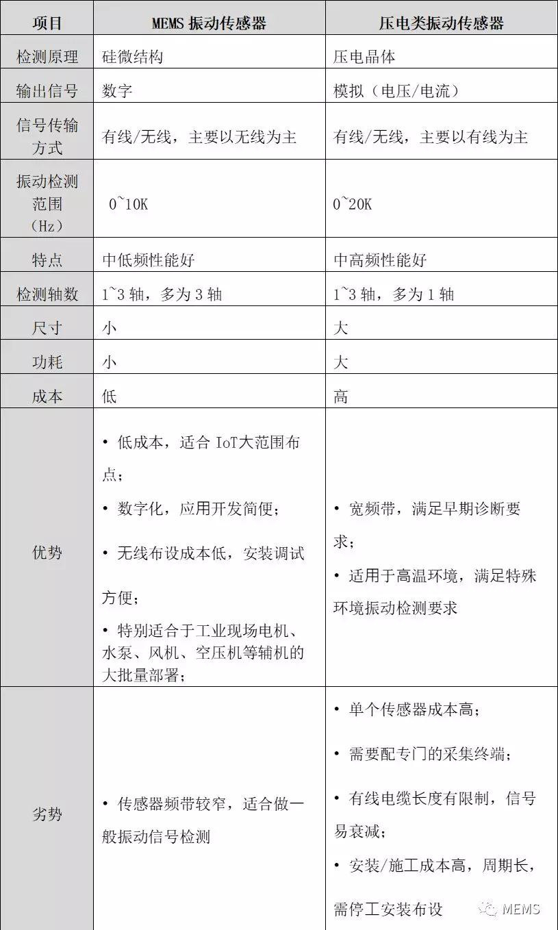 随着市场经济的不断发展,振动传感器在能源、化工、汽车、冶金、机器制造、军工和科研教学等诸多领域得到广泛的应用。振动传感器主要监测包含旋转机械的振动情况。不同行业,每种设备都有其振动标准,超过标准表明机器出现或者将要出现故障,从而实现状态监控以及预测性维护。振动传感器是设备状态监测的“听诊器+心电图仪”。目前主要有MEMS和压电两类传感器,各有其优缺点和适用场景,参见如下: