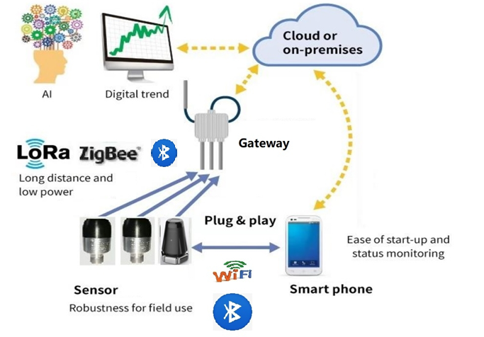 捷杰传感智能无线传感器在线检测系统,通过无线振动监测传感器和无限网关实现数据4G上云或到中央服务器。通过LoRa\Zigbee\BLE\Wifi等无线传输方案,涵盖无线传输距离从30米至3000米的广大范围,设备端无需部署电缆网线,安装便捷,尤其适用于各类辅机的智能化升级的后装市场。