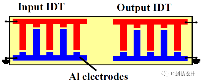 In a SAW component mechanical waves propagate on the surface of a solid. To convert an electrical signal into a mechanical wave so called Interdigital Transducers (IDT) patterned on a piezoelectric solid are used. A second IDT converts this mechanical wave back into an electrical signal. Piezoelectric materials like Lithium Tantalate (LiTaO3), Lithium Niobate (LiNbO3) or Quartz are used as substrate materials. In Figure 1 the basic layout of a SAW Filter is shown.