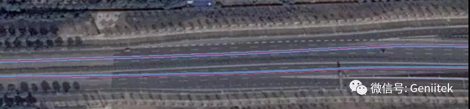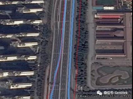 在正常空旷路面行驶, 蓝色的MG10定位轨迹和普通红色的GPS信号几乎重合,都能满足1米内的精确定位。
