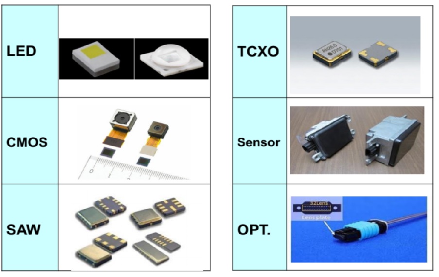 声表面波滤波器(Saw filter)、CMOS Sensor,LED,TCXO、Opto,RF Module等。